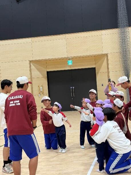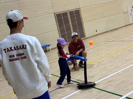 この事業により、高崎高校野球部も12月11日(木)14:00~高崎市労使会館にて、法輪寺まちなかこども園年長児9名と2年部員12名で実施しました。自己紹介をしてからウォーミングアップ(ラジオ体操第一)、ボールキャッチ、ティーバッティングを行いました。