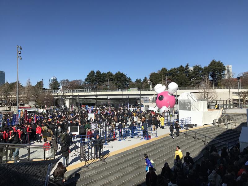 千駄ヶ谷駅の目の前にある東京体育館で、バレー部がまもなく1回戦を迎えます。会場前は応援団で大混雑しています。