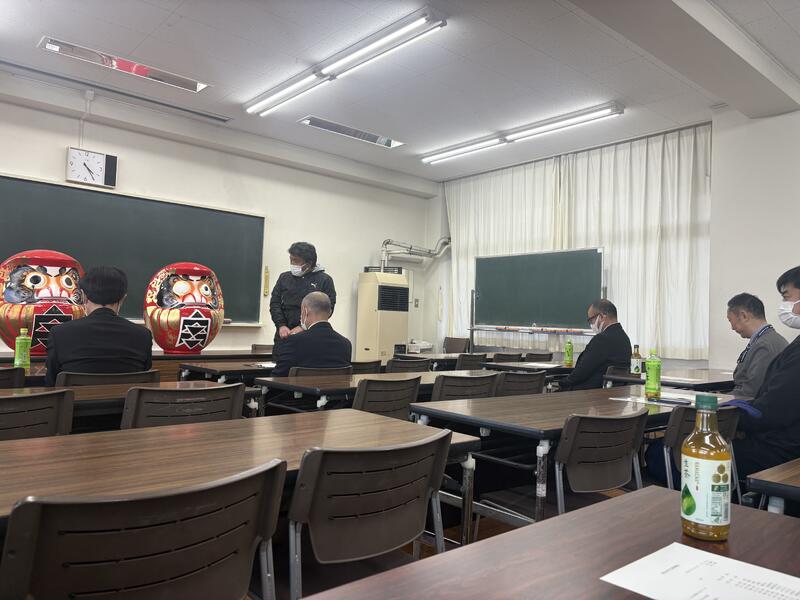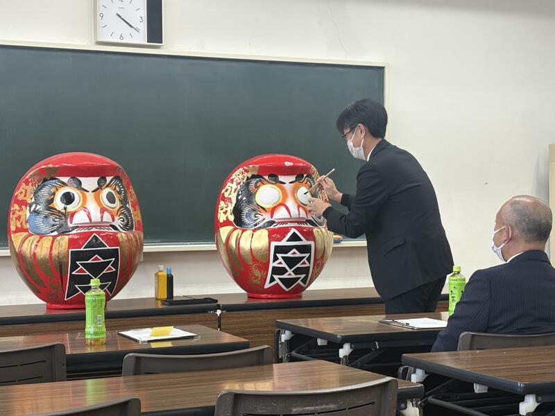 1月8日(木)、全職員参加のもと「だるま開眼式」を行いました。 生徒の活躍と学校の発展を祈念し、校長、管理職、学年・分掌主任がそれぞれの抱負とともにだるまの目入れを行いました。