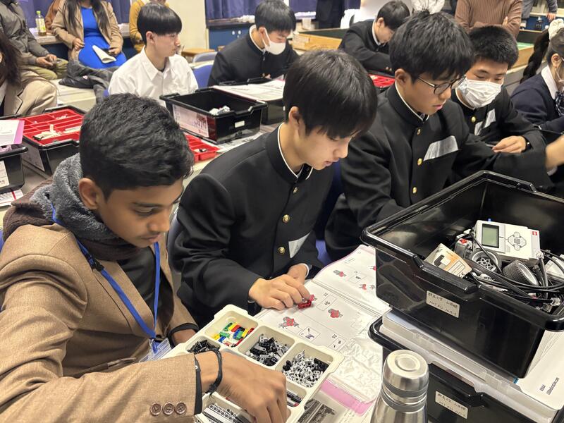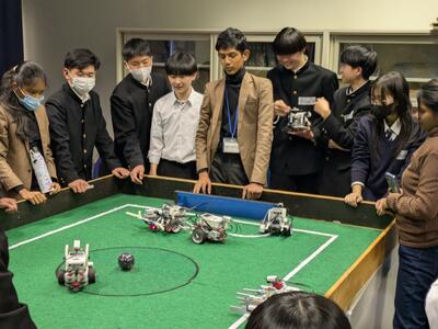 生徒たちは多国籍なチームに分かれ、留学生のアドバイスを受けながら試行錯誤を繰り返し、ロボットを完成させました。