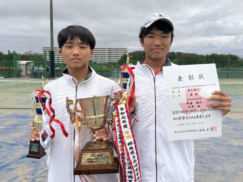 令和7年10月18日、19日に行われた群馬県高等学校新人ソフトテニス大会男子個人戦おいて、本校ソフトテニス部2年牧野君と齊藤君が男子ダブルスで優勝しました。おめでとうございます!