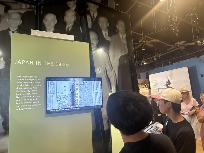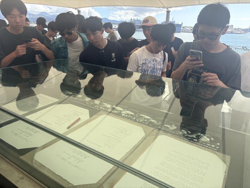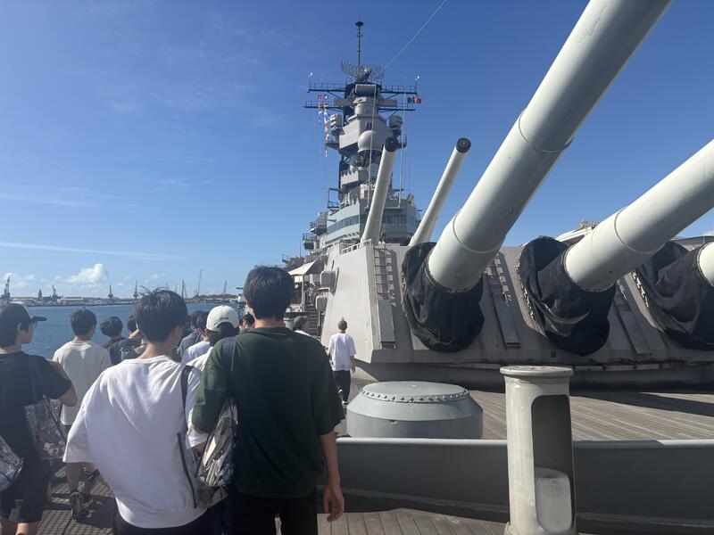 午前中は、まず「USSアリゾナ記念館」を訪問し、真珠湾攻撃に関する歴史的資料や、当時実際に使用された魚雷などの展示を見学しました。続いて「戦艦ミズーリ記念館」では、艦内を見学し、当時の海軍兵士の生活や歴史の重みを追体験しました。日本とハワイの歴史を語る上で、戦争は避けて通れないトピックです。今回の訪問を通じ、生徒たちは「アメリカ側から見た当時の日本」という視点に触れることができ、多角的な視野で歴史を捉えるきっかけになったようです。平和について深く考える、非常に意義深い時間となりました。