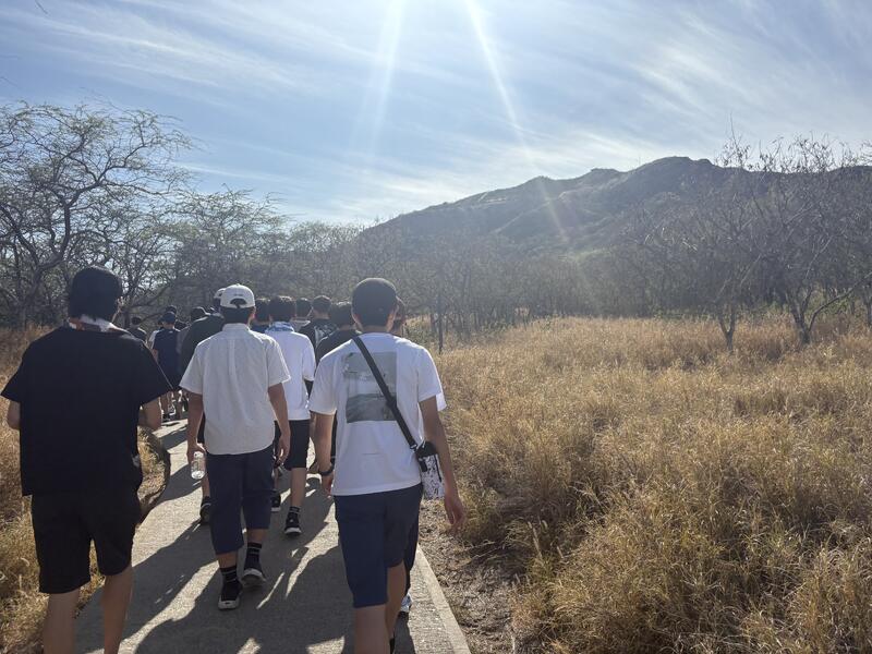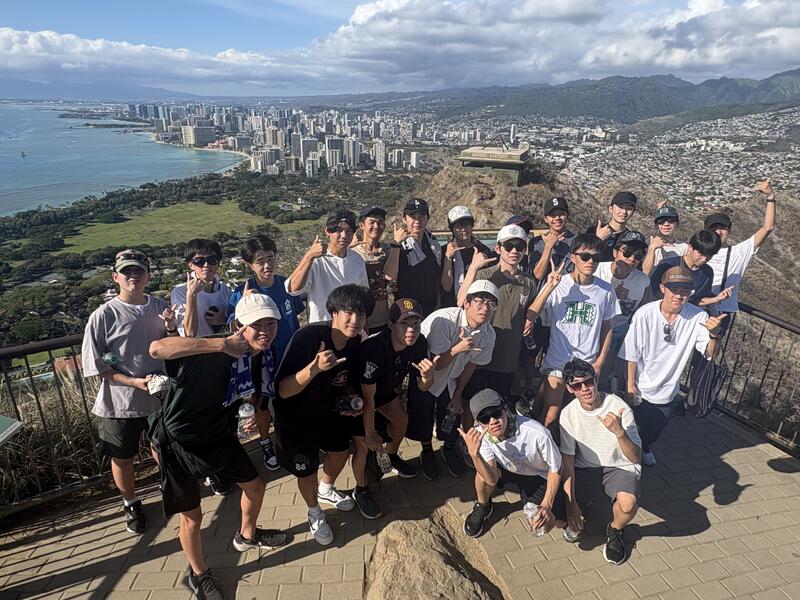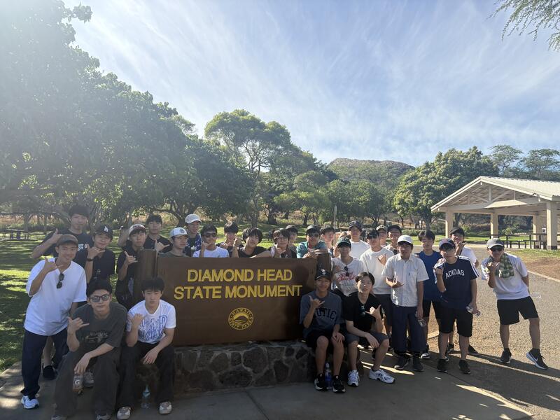 昼休憩の後は、ダイヤモンドヘッドの登山を行いました。 強い日差しが照りつける中での登山となり、決して楽な道のりではありませんでしたが、頂上に辿り着いた瞬間、眼下に広がるホノルルの街並みと青い海の美しさに生徒たちは深く感動している様子でした。