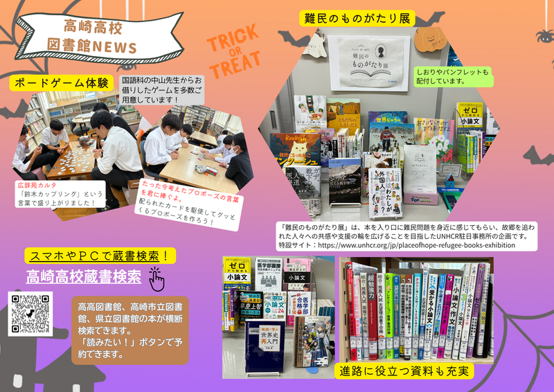 5月31日、6月1日に開催された翠巒祭、図書委員会はフォト短歌を展示しました。短歌のお題は「高崎高校」。短歌のイメージに合わせた写真も準備し、Canva(キャンバ)でデザインしました。昨年作成したすごろく、一昨年作成したカルタも同時に展示しました。