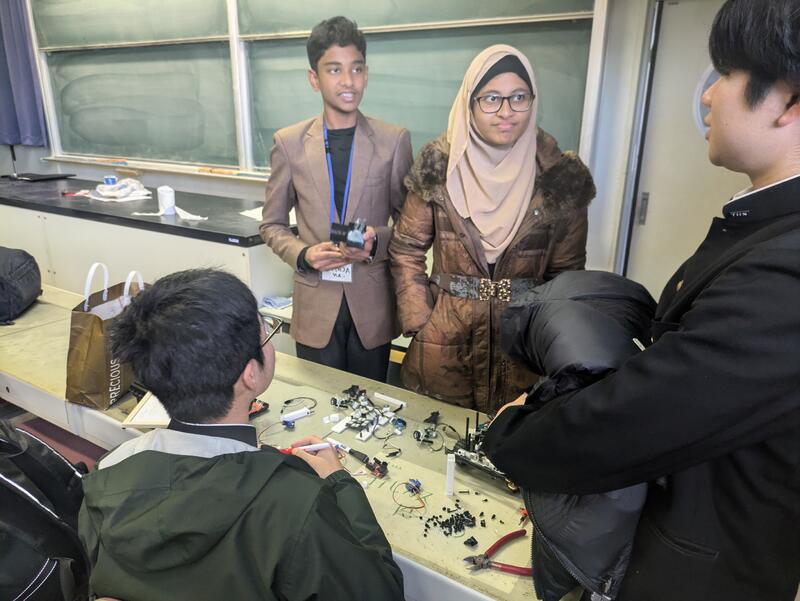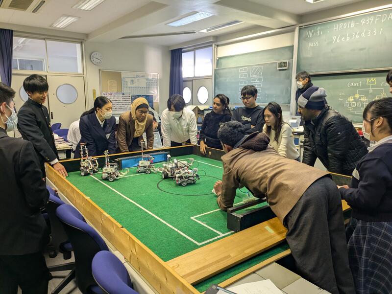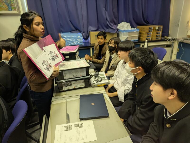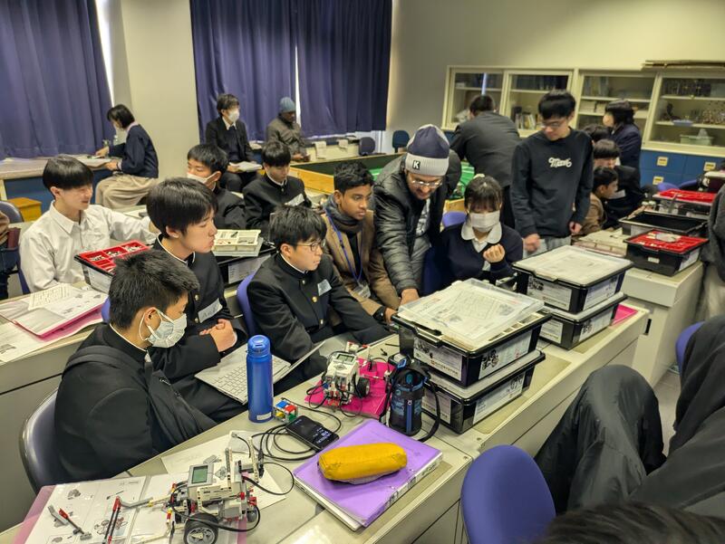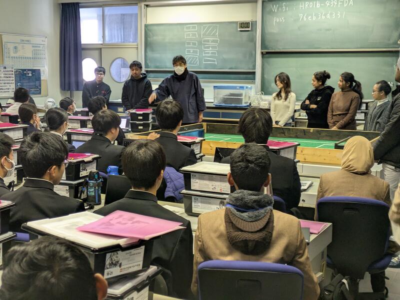 1年生全員を対象とし、群馬大学理工学部の山田功教授ならびに研究室所属の博士留学生によるワークショップを英語で行いました。中国、ベトナム、タイ、パキスタン等の留学生が各クラスに分かれ、母国や大学の研究内容の紹介をしていただき、その後、本校生徒から英語での質疑が活発に行われました。また、「passive walk robot」の製作を留学生や本校生徒と英語を交えながら協働して行いました。