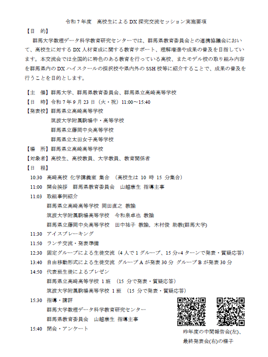 9月23日(火・祝)に、群馬大学、群馬県教育委員会のご協力のもと、高崎高校を会場に「高校生によるDX探究交流セッション」(参加校:筑波大学附属駒場高校、藤岡中央高校、太田女子高校)を開催しました。