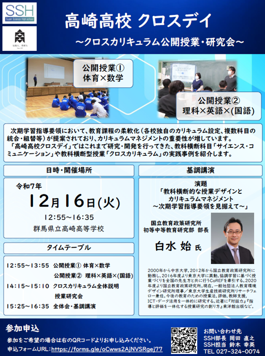 令和7年12月16日(火)に本校を会場に「高崎高校クロスデイ~クロスカリキュラム公開授業・授業研究会~」を開催します。教科横断科目「サイエンス・コミュニケーション」や教科横断型授業「クロスカリキュラム」の実践事例について紹介するとともに、国立教育政策研究所 初等中等教育研究部 部長 白水始 様による基調講演も予定されています。